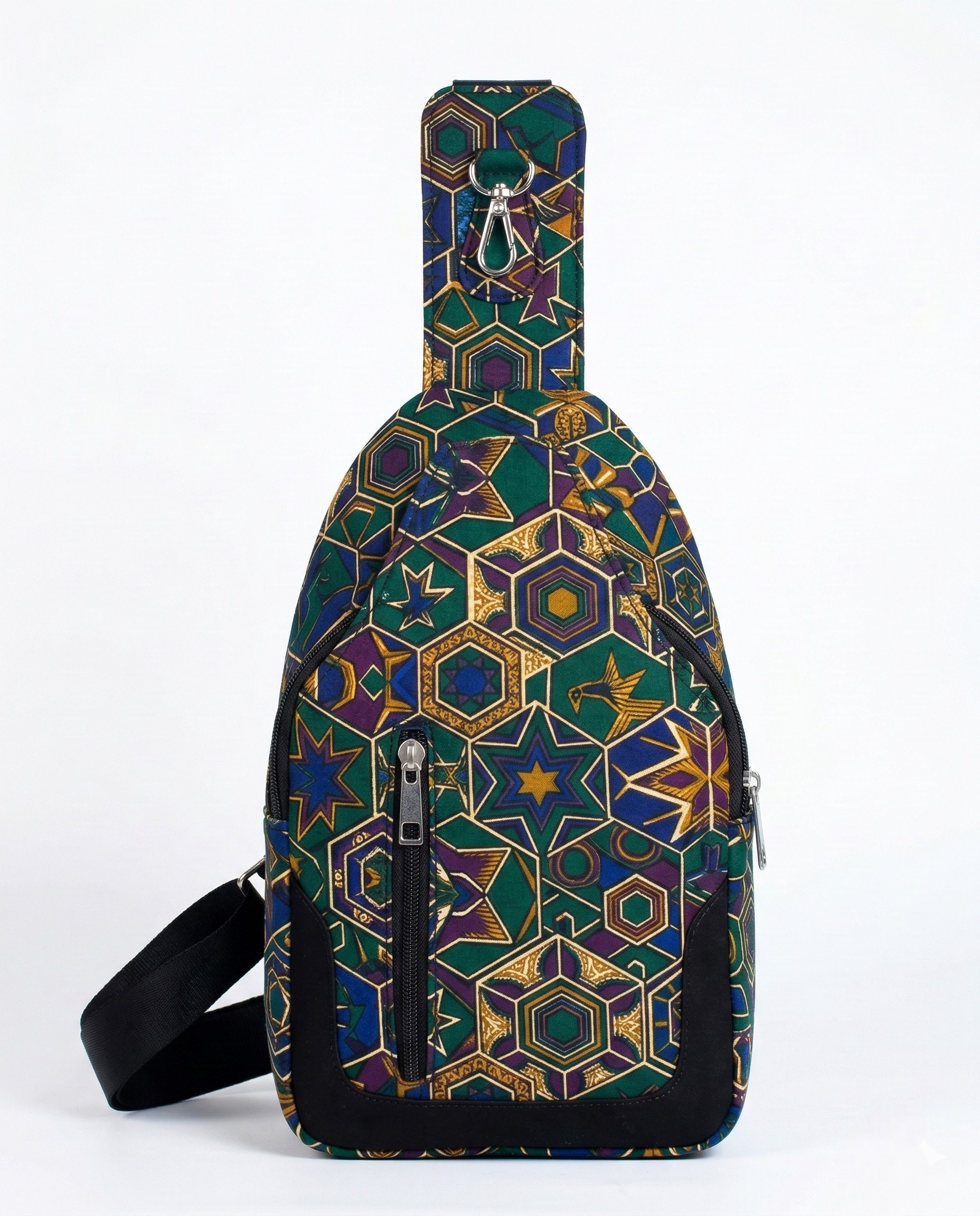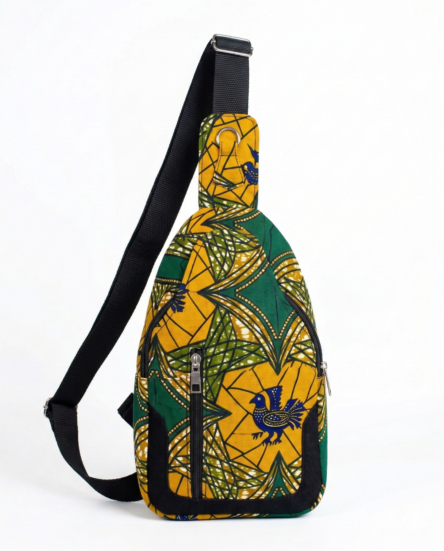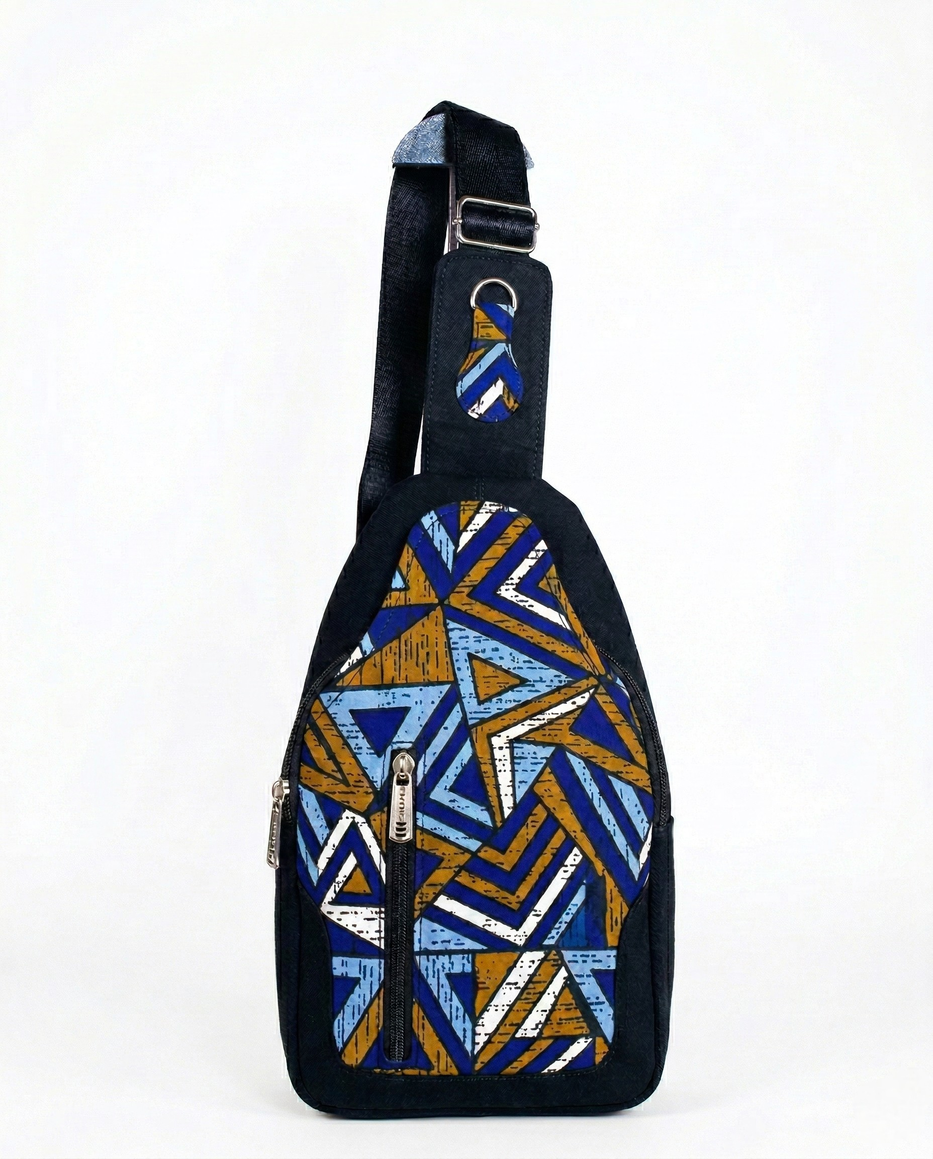 • Ankara wax print front panel on a black canvas structured body