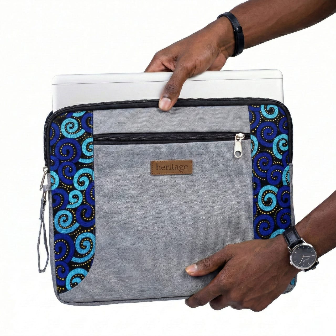 Protect your laptop with a piece of heritage. The Heritage Ankara laptop sleeve is a slim, padded carry case designed for everyday use — with a distinctive twist. Each sleeve pairs a clean canvas body in black or grey with bold African wax print side panels that frame the bag with cultural colour. Swipe through the four variants to find your combination: Black & Kente Zigzag, Grey & Kente Zigzag, Black & Blue Swirl Ankara, or Grey & Blue Swirl Ankara.